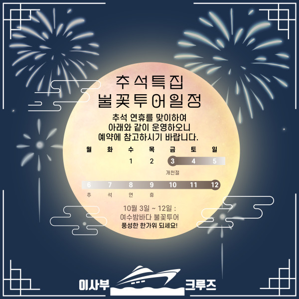 추석 특집 불꽃 축제 일정 안내 2025-09-27 0 2226 09.27 17:15 안녕하세요 24view⛴️이사부크루즈 윤실장입니다. 올해 추석 연휴는 황금연휴라고 할 수 있죠! 그에 걸맞게 저희 이사부크루즈가 추석 특집 불꽃투어 일정을 알차게 준비했습니다! 모든 분들 넉넉하고 풍성한 한가위 보내시고, 추석 연휴기간 250% 증가한 특별 불꽃축제로 여러분 곁을 찾아갑니다! 긴~ 연휴 기간 저희 이사부크루즈에서 행복한 시간 즐겨주세요~!