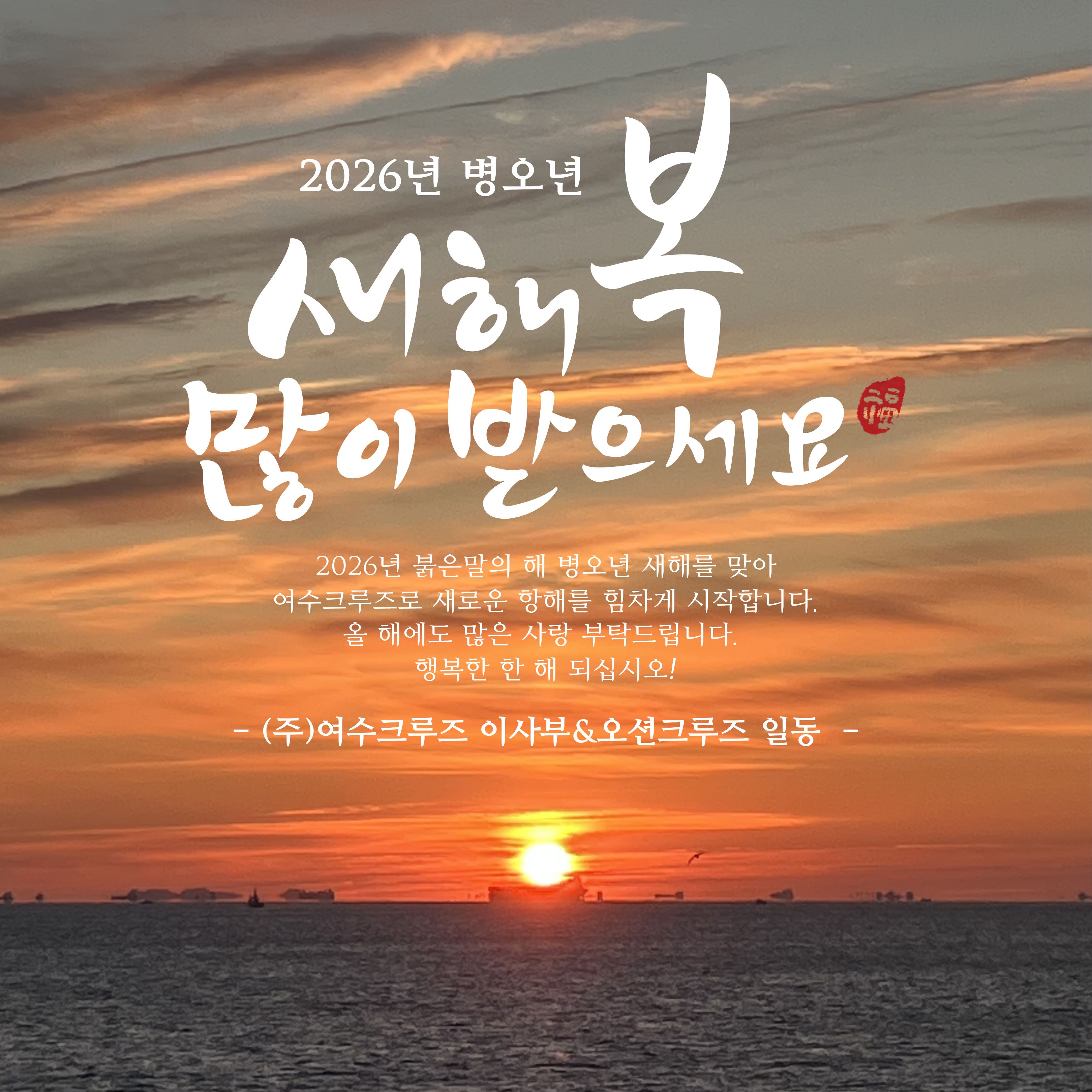 새해 복 많이 받으세요! 2026-01-03 0 108 01.03 13:19 안녕하세요 24vie⛴️이사부크루즈 윤실장입니다. 2026 여수크루즈 힘차게 출발 2026년 붉은말의 해 병오년 새해를 맞아 여수크루즈로 새로운 항해를 힘차게 시작합니다. 올 해에도 많은 사랑 부탁드립니다. 행복한 한 해 되세요! 이사부크루즈와 2026 첫 항해 해돋이 특별출항 함께해 주셔서 감사합니다. 올 해에도 더 큰 기쁨과 만족을 드릴 수 있도록 노력하겠습니다.
