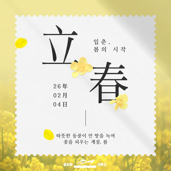 벌써? 봄의 시작~ 입 춘 2026-02-11 0 16 02.11 16:59 안녕하세요 24view⛴️ 윤실장입니다. 입춘대길, 건양다경 입춘은 눈에 보이는 봄보다 한 발 먼저 찾아옵니다. 시기적으로는 아직 차갑고 춥지만 올해 계획을 다시 떠올려보게 되고, 한 번 더 마음을 다잡으시길 바랍니다. 여러분의 올해 입춘이 작년보다 더 따스하길, 이사부크루즈가 진심으로 바라고 응원하겠습니다!